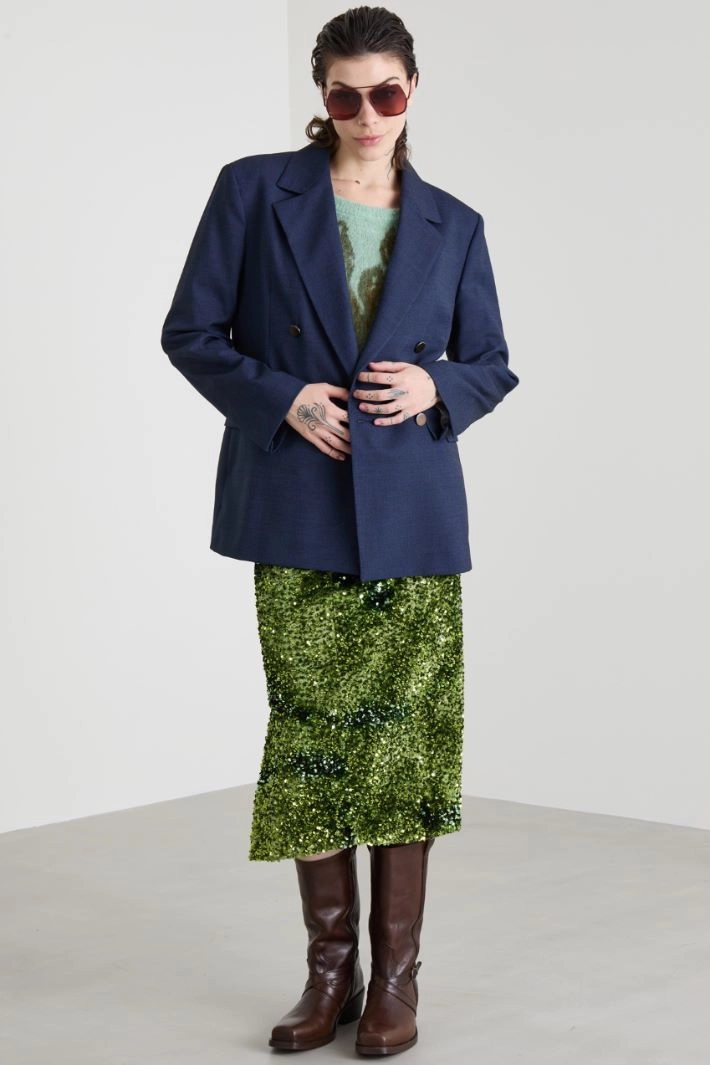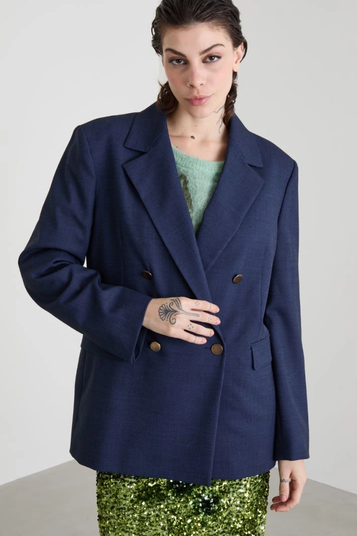 Straight-fit blazer in wool blend grisaille, with lapel collar, long sleeves with slit at the wrist and double-welt side pockets with flap. Double-breasted button fastening. Lined.