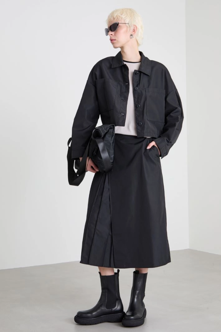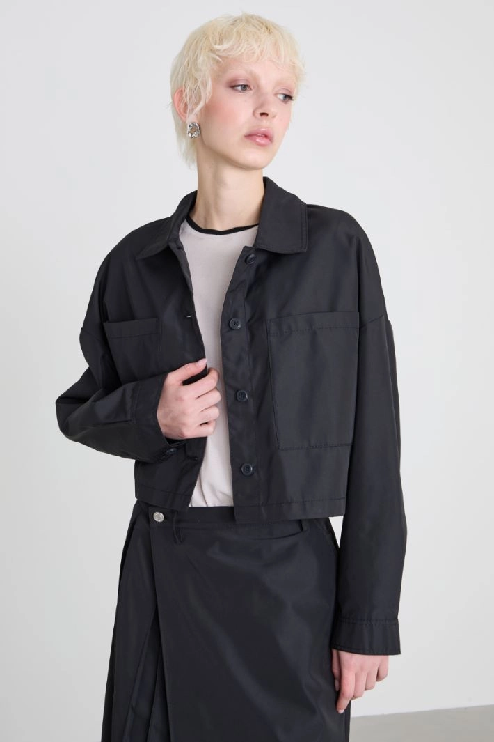 Straight-fit jacket in technical duchesse, with shirt collar, long sleeves with cuff and button, and patch pockets on the front. Button fastening.