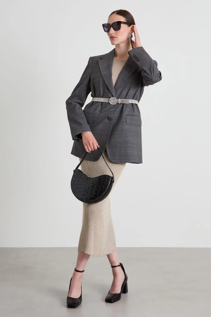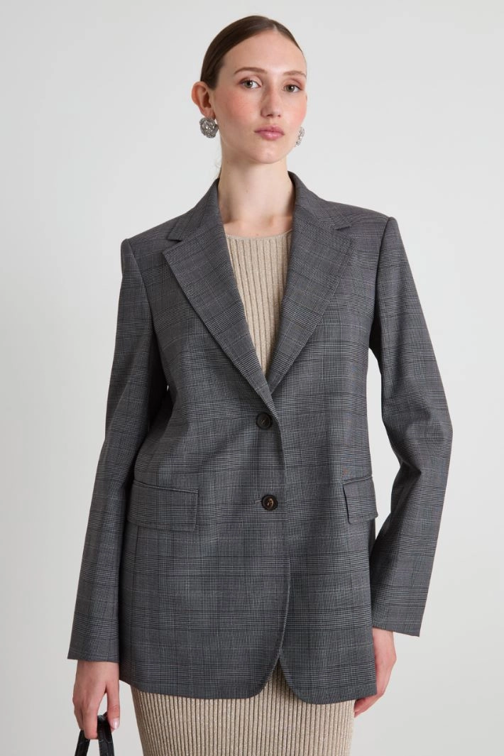 Straight-fit blazer in yarn-dyed stretch wool blend Prince of Wales check, with lapel collar, long sleeves with buttons and double-welt side pockets with flap. Central vent on the back and single-breasted fastening with buttons. Lined.