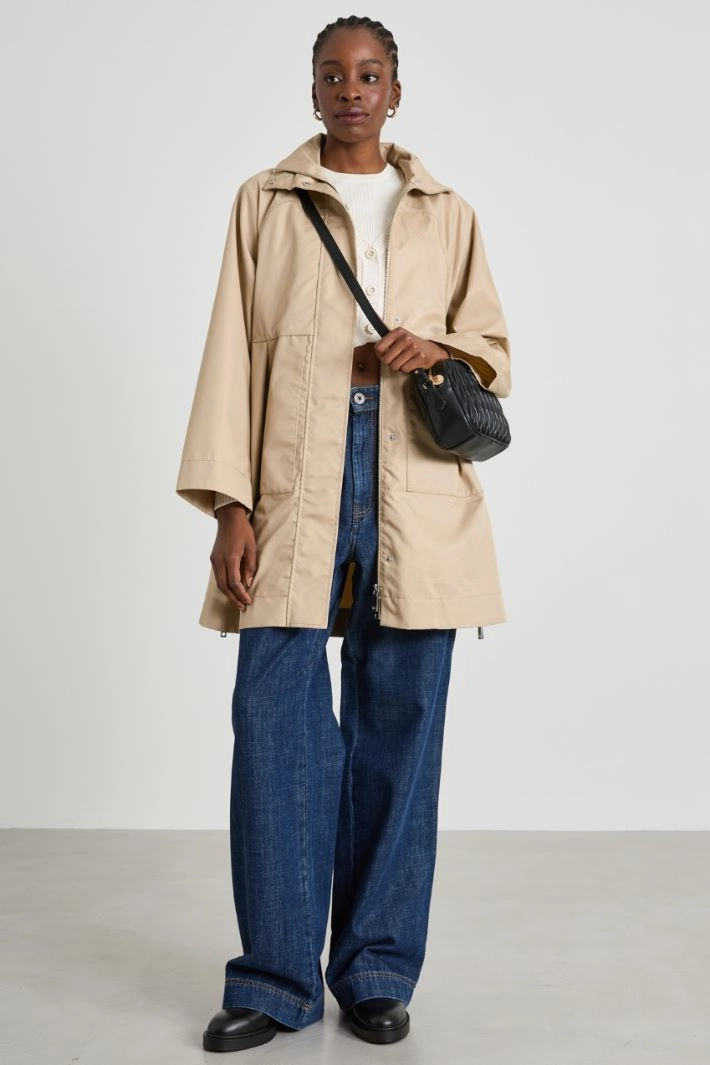 Flared parka in water-repellent cotton-blend gabardine, with high collar and hood, long raglan sleeves, side patch pockets and a counter pleat motif on the back. Side zip openings and hidden fastening with double-slider zip and buttons.