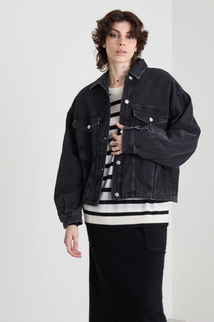 Oversized denim jacket with shirt collar, patch pockets with flap and button and long sleeves with cuffs. Front fastening with buttons. Padded.