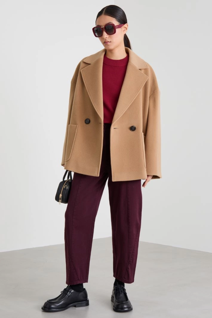 Oversized pea coat in pure wool drap, with wide lapels, dropped shoulders, long sleeves, and patch pockets. Double-breasted fastening with buttons. Lined.