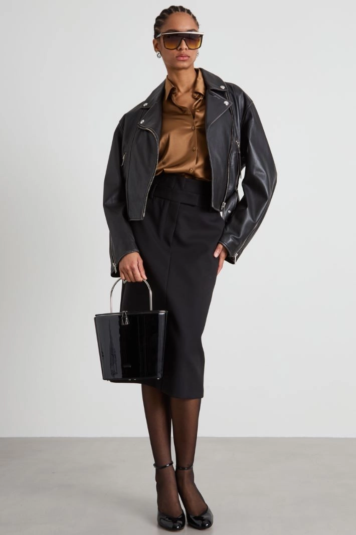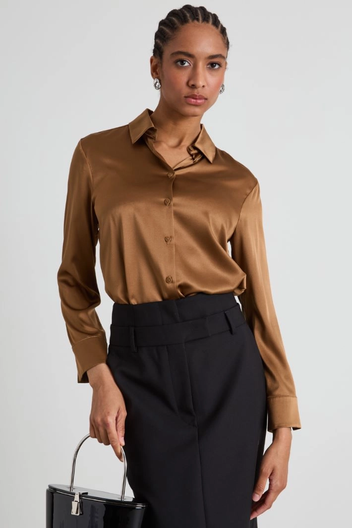 Flowing shirt in stretch silk satin, with classic collar, long sleeves with cuff, yoke cut with counter pleat on the back and rounded hem. Fastening with visible buttons.