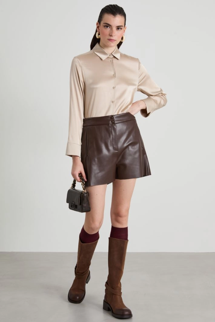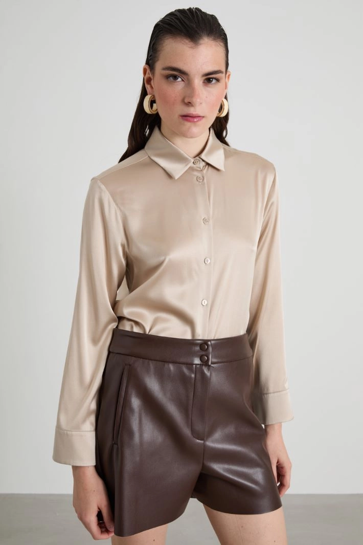 Flowing shirt in stretch silk satin, with classic collar, long sleeves with cuff, yoke cut with counter pleat on the back and rounded hem. Fastening with visible buttons.