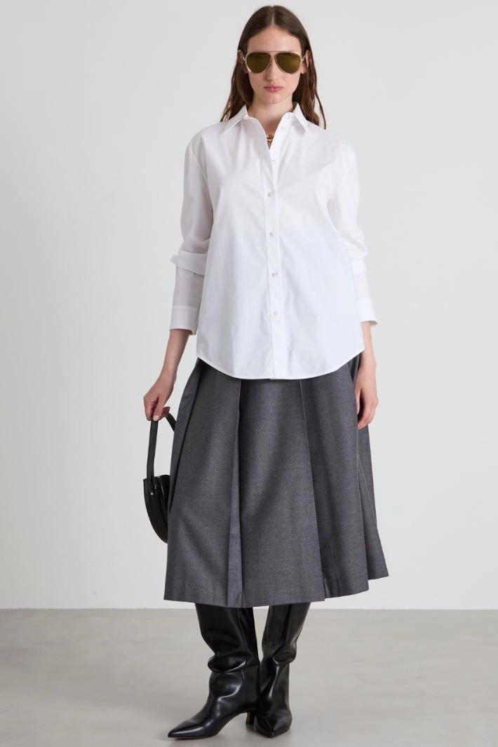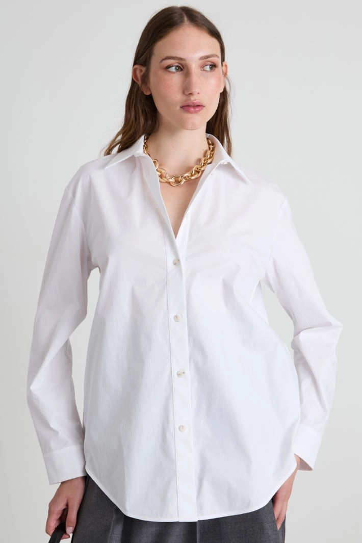 Straight-cut shirt in pure cotton poplin, with classic collar, long sleeves with cuffs and buttons, and button fastening.