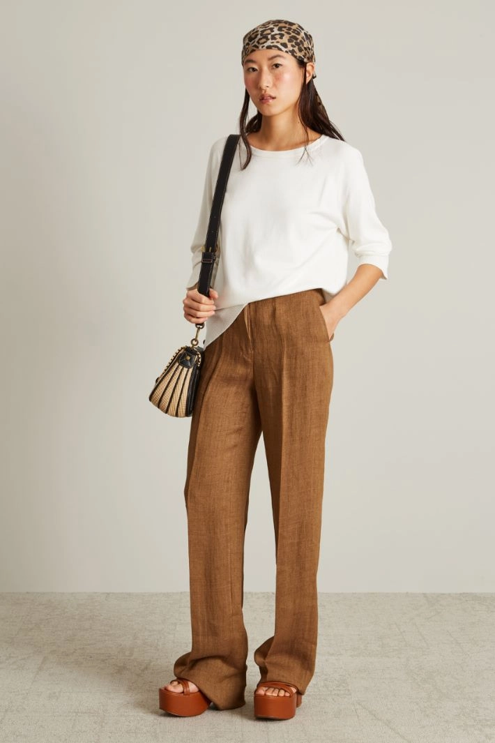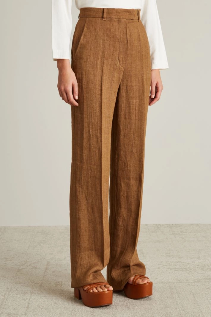 Loose-fit trousers in pure linen Batavia fabric with belt loops at the waist, French side pockets, pressed crease and hidden fastening with zip, button and hook.