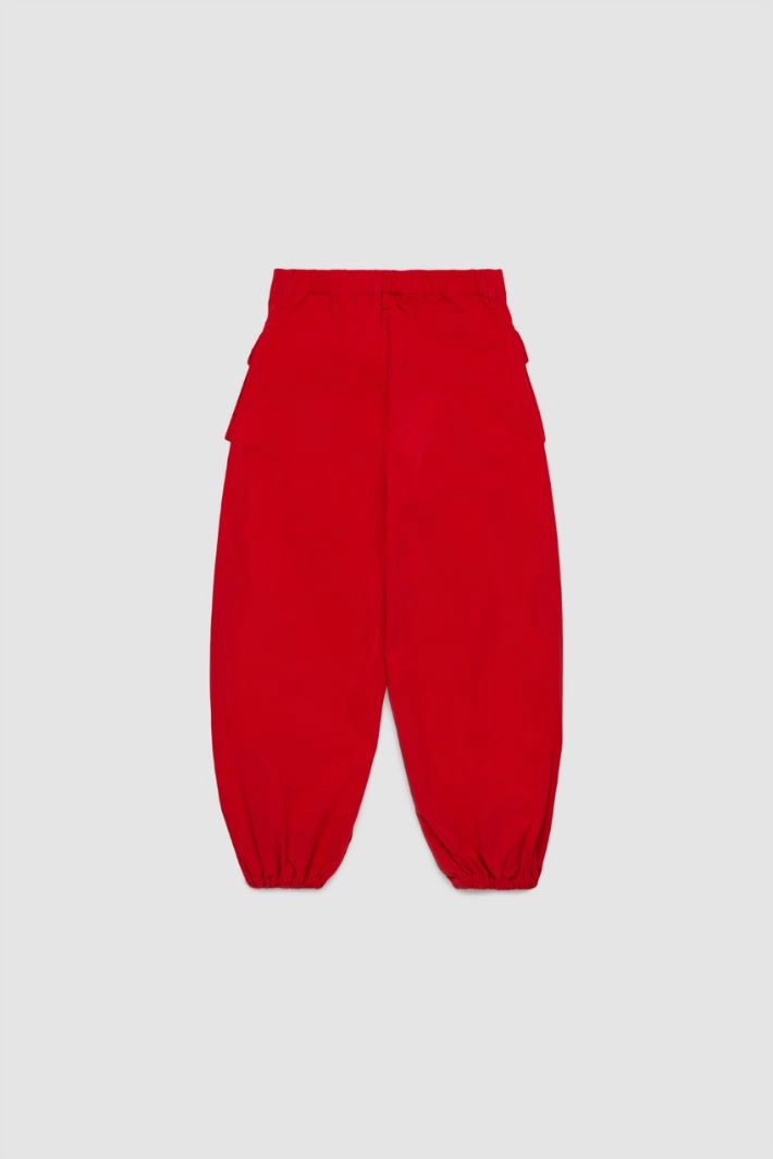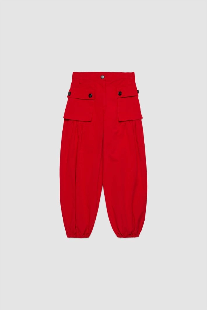 Balloon-fit cargo trousers in a cotton-blend drill, complete with belt loops, front patch pockets with buttons and elasticated ankle cuffs. Darts at the front lend volume to the garment. Zip fly and button fastening.
