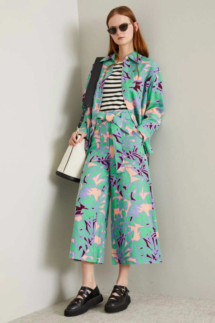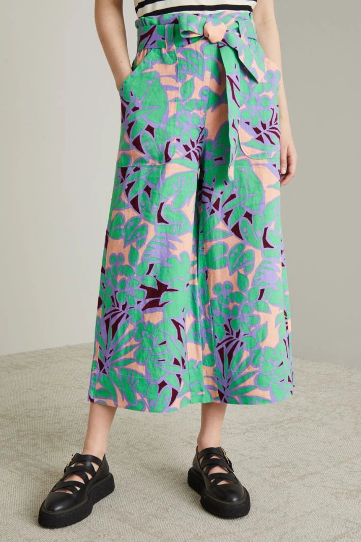 Cropped flared linen trousers with belt, belt loops and French pockets. Zip and sash fastening.
