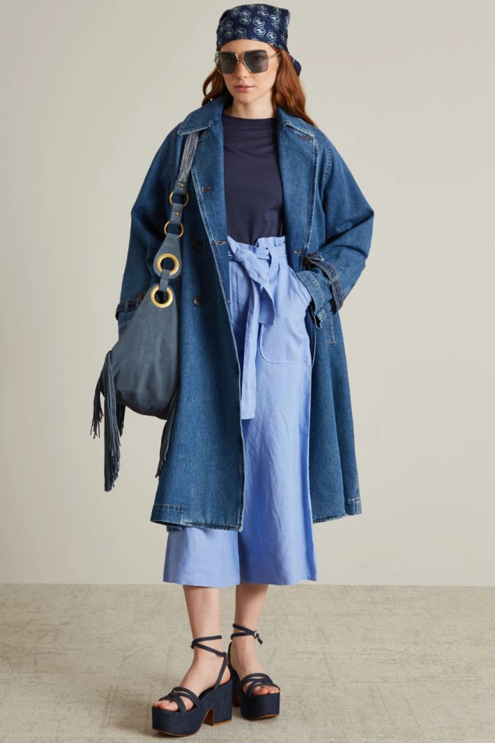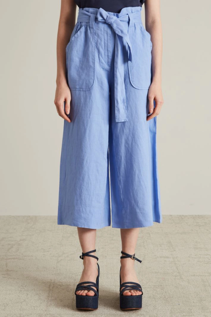 Cropped flared linen trousers with belt, belt loops and French pockets. Zip and sash fastening.