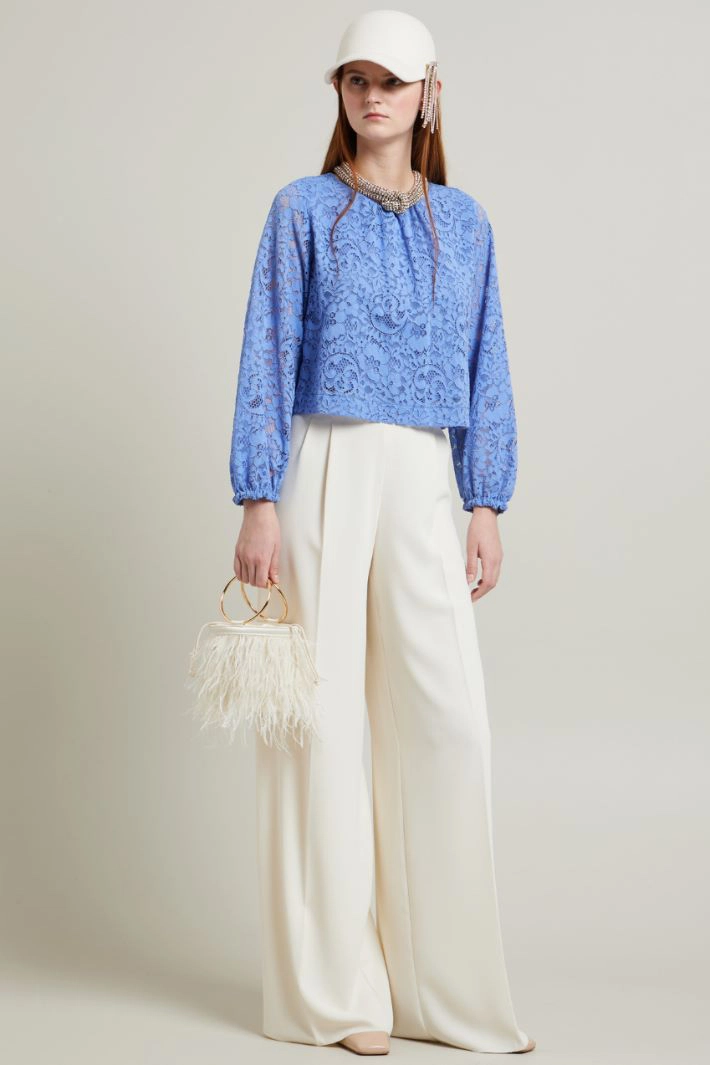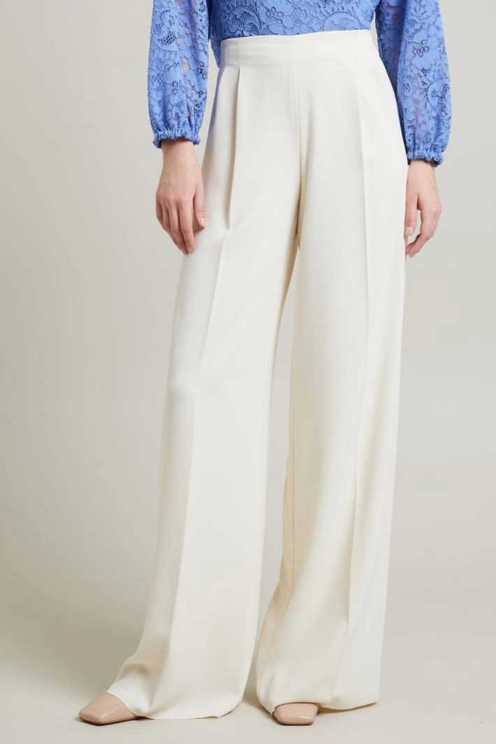 Cady palazzo trousers with pleats sewn at the waist and fastening with an invisible zip on the back.