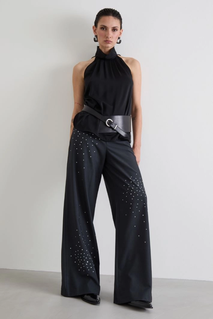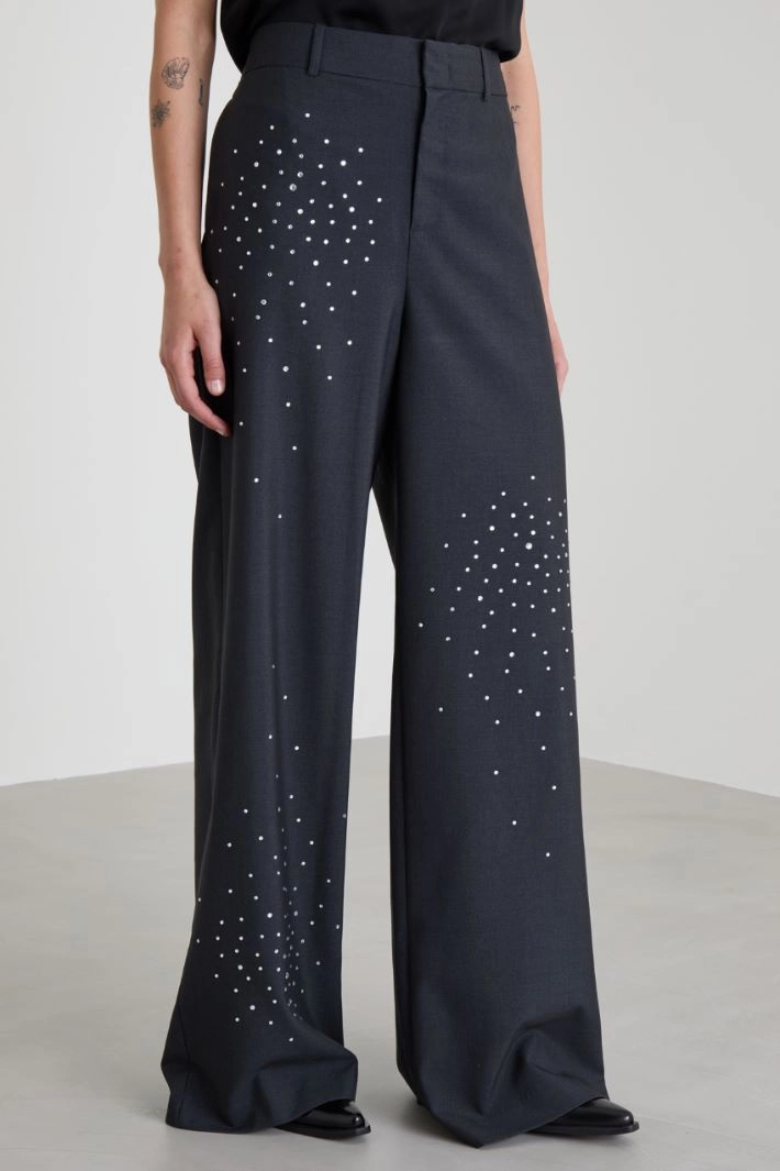 Straight-cut viscose blend canvas trousers with rhinestone applique details, belt loops, side pockets inset in the seams and rear welt pockets. Fastening with hidden zip, button and hook.