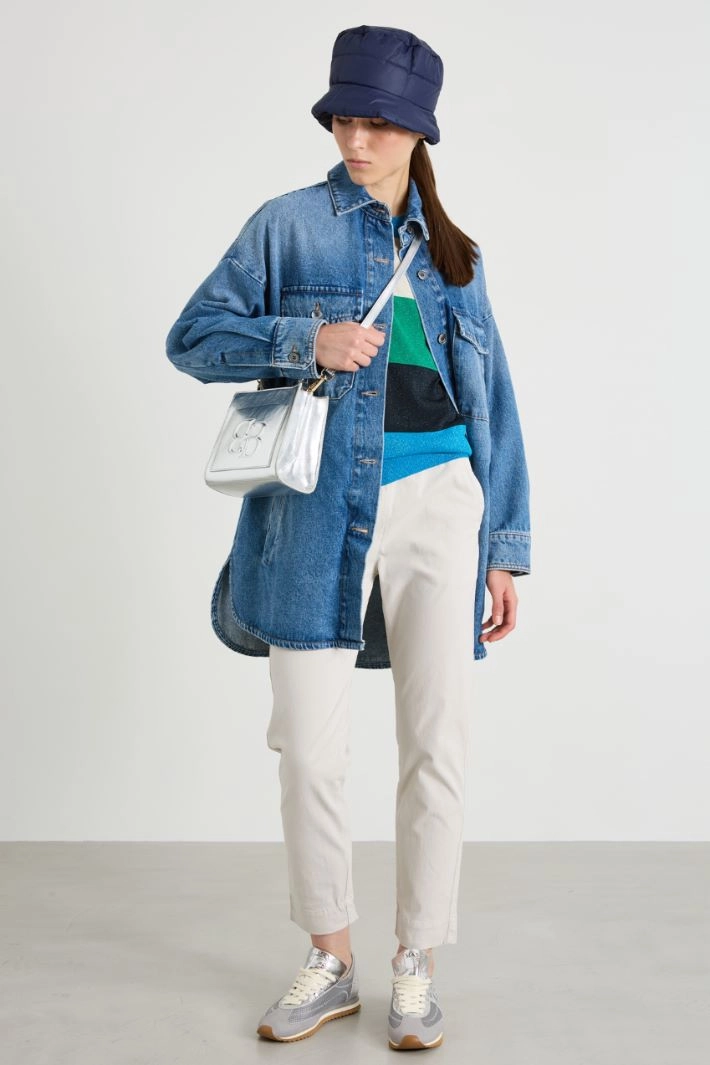 Baggy trousers in stretch cotton satin, with elastic drawstring waist and French side pockets.