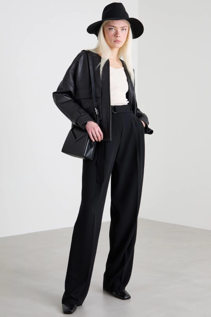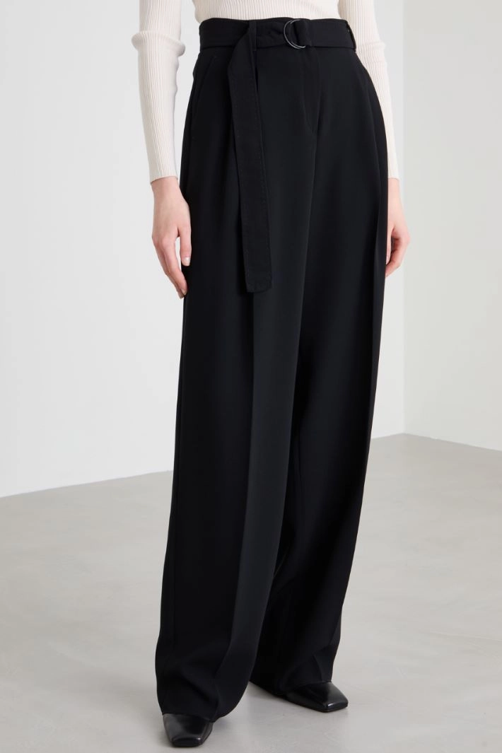 Loose-fitting cady trousers with topstitching, belt loops, darts, French pockets and a crease pressed along the length. Concealed fastening with zip, button and hook. Matching belt.