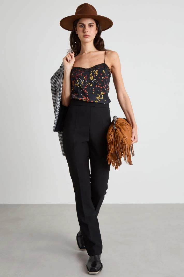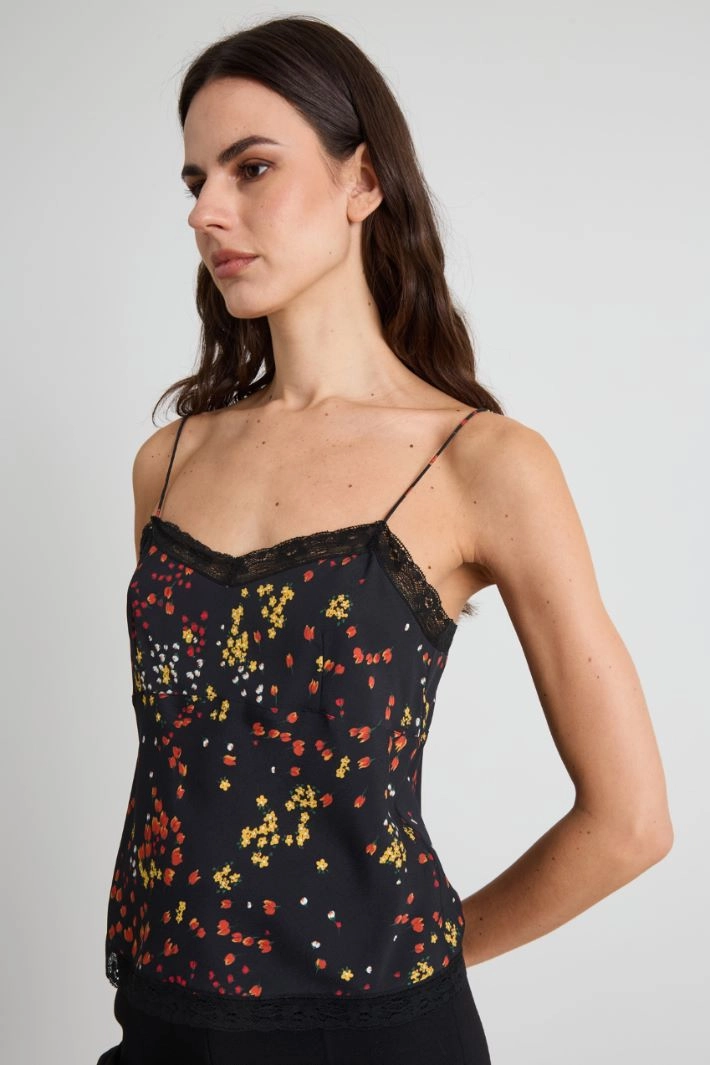 Slip top in printed crepe de chine, with lace inserts on the edges, V-neckline and thin shoulder straps.