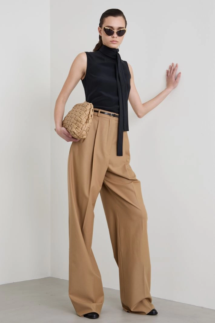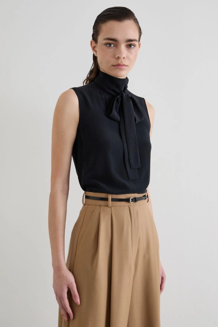 Flowing sleeveless top in pure silk crepe de chine, with scarf collar and teardrop fastening with button on the back.