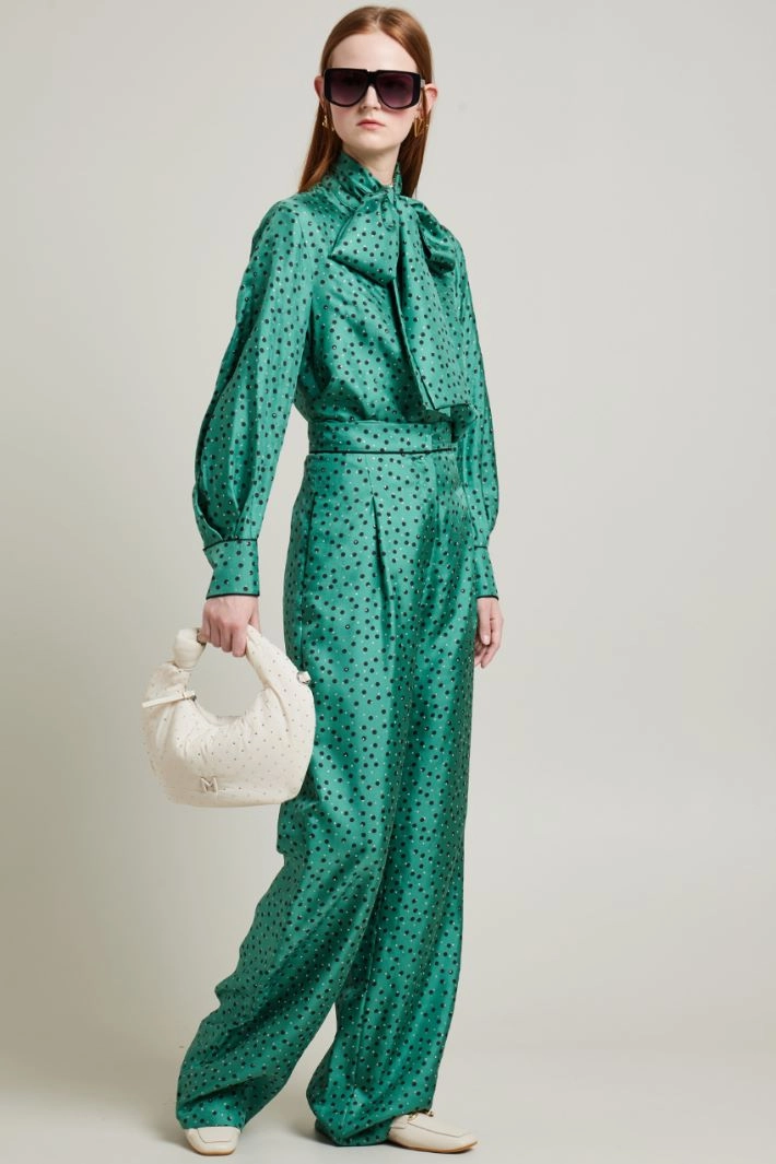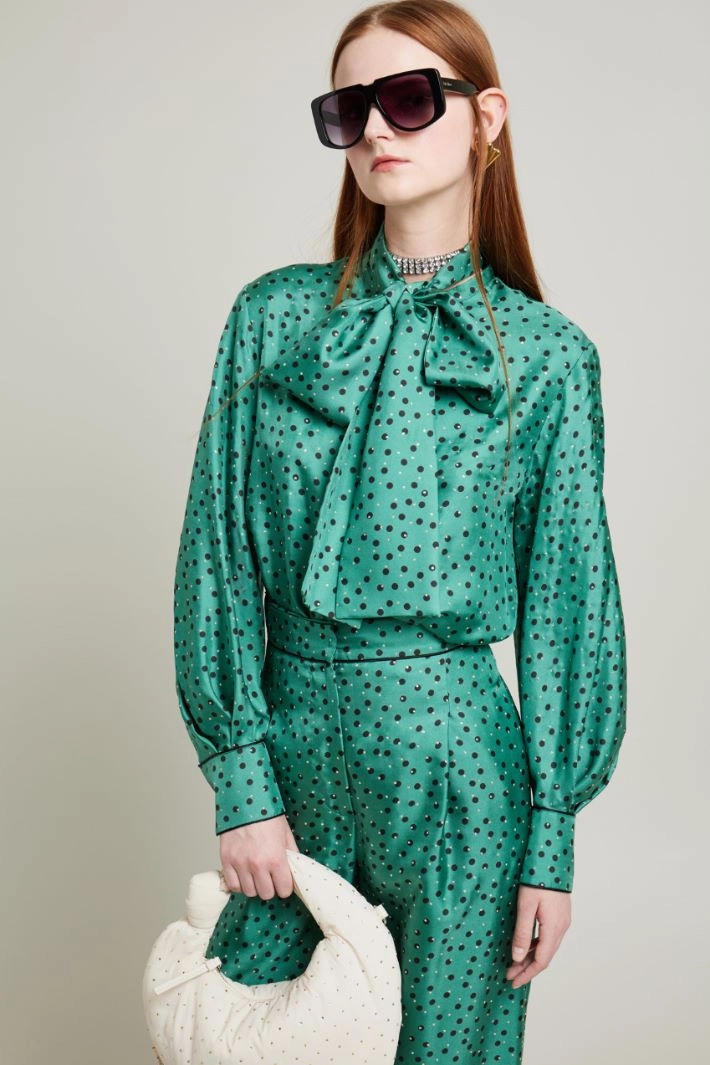 Flowing blouse in pure silk twill with all-over print, Mandarin collar, long sleeves with cuffs finished with piping and jewel button, side slits and matching removable scarf. Hidden button fastening.