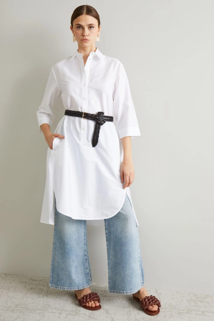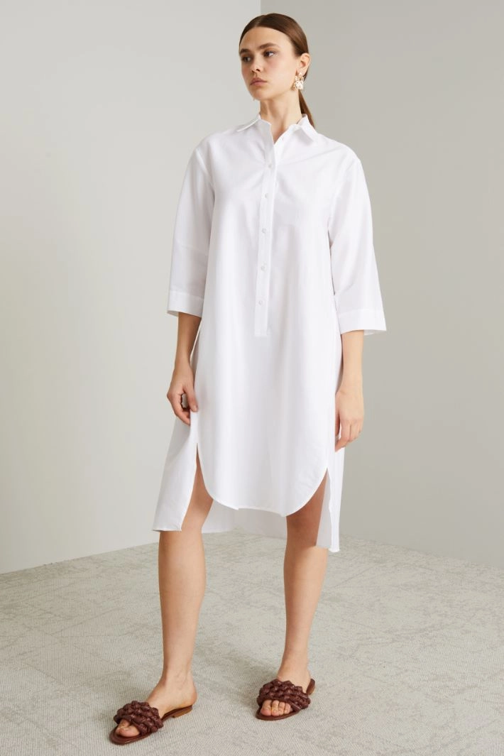 Flared and loose shirt dress in stretch cotton-blend poplin, with classic collar, three-quarter sleeves, side pockets inserted in the seam, asymmetrical hem and yoke cut with pleats on the back. Button fastening.