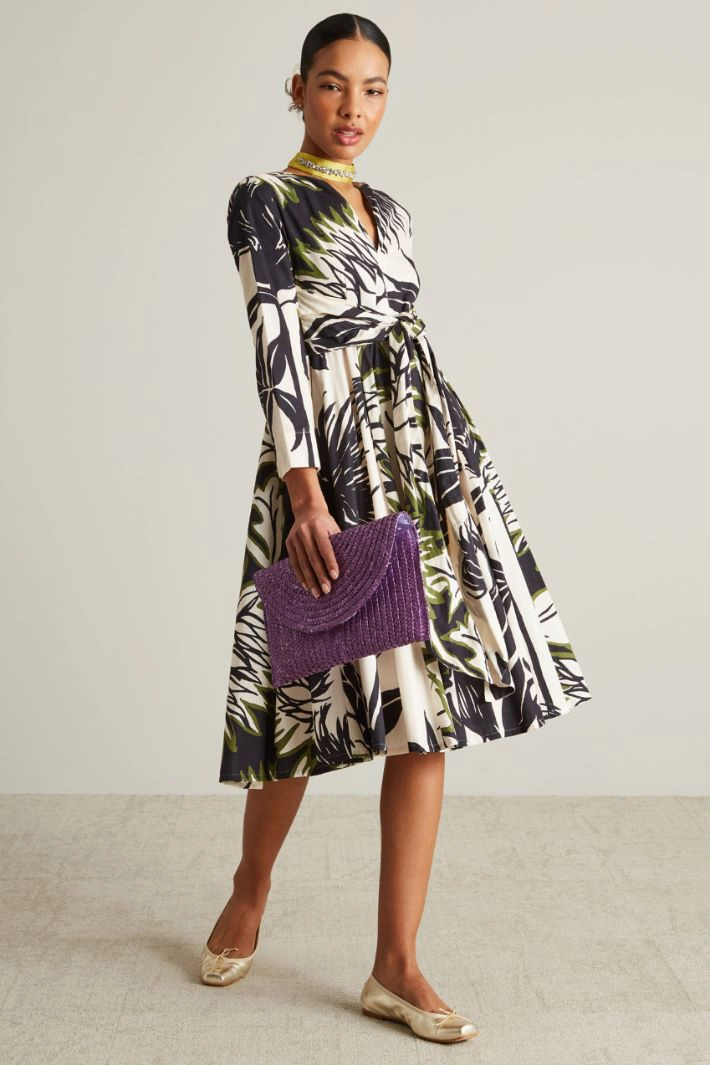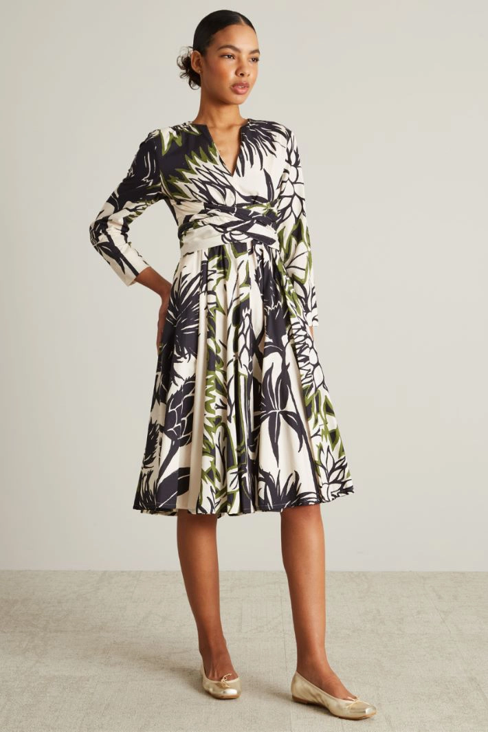 A-line dress in pure cotton poplin, with round neckline and V-neckline, long sleeves, inset side pockets and a sash to tie at the waist. Invisible zip fastening on the back.