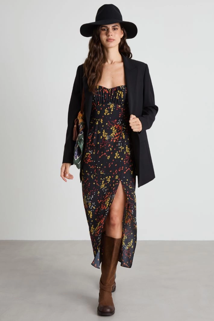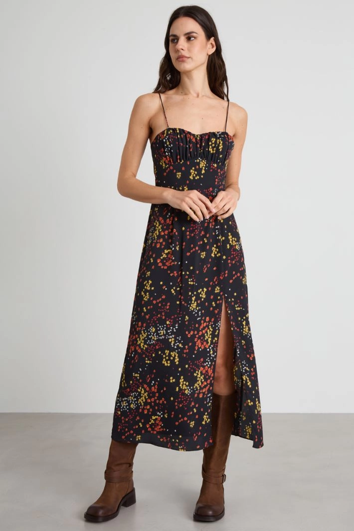 Slip dress with a flowing line in printed crepe de chine, with a gathered motif on the bodice, V-neckline on the back, thin shoulder straps and a side slit at the bottom. Fastening with an invisible zip on the back.