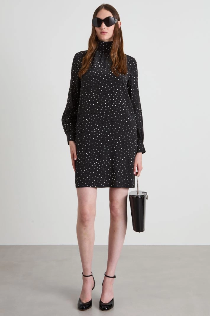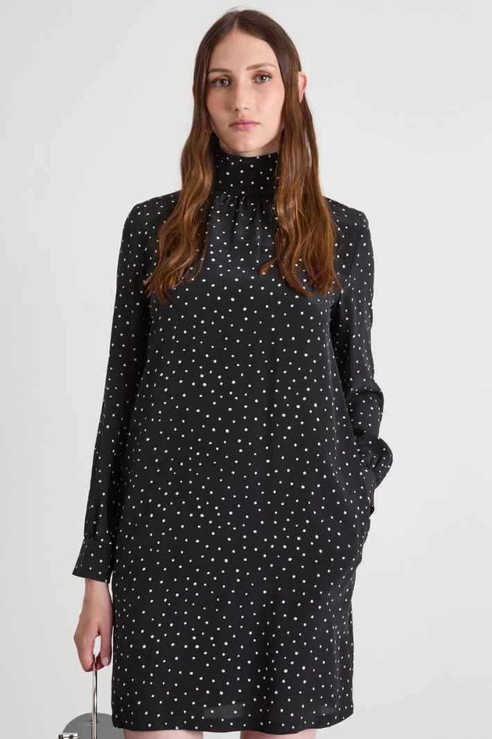 Straight-fit dress in printed silk, with a high collar and light gathering, long sleeves with cuff and button, and inset side pockets. Teardrop fastening with buttons. Lined.