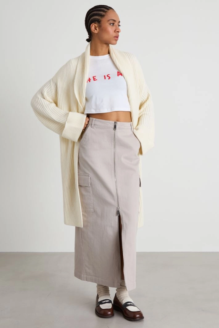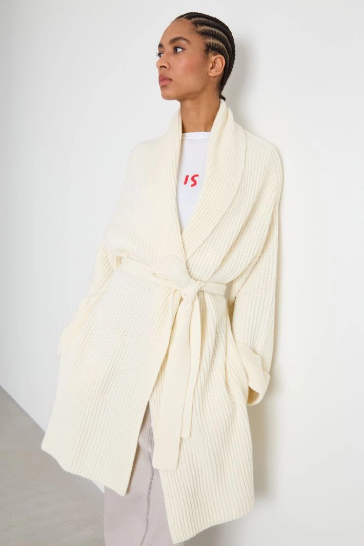Long, loose-fit jacket in ribbed wool blend yarn, with shawl collar, long sleeves with dropped shoulders and cuffs, side pockets sewn into the seam and fastening with a matching belt.