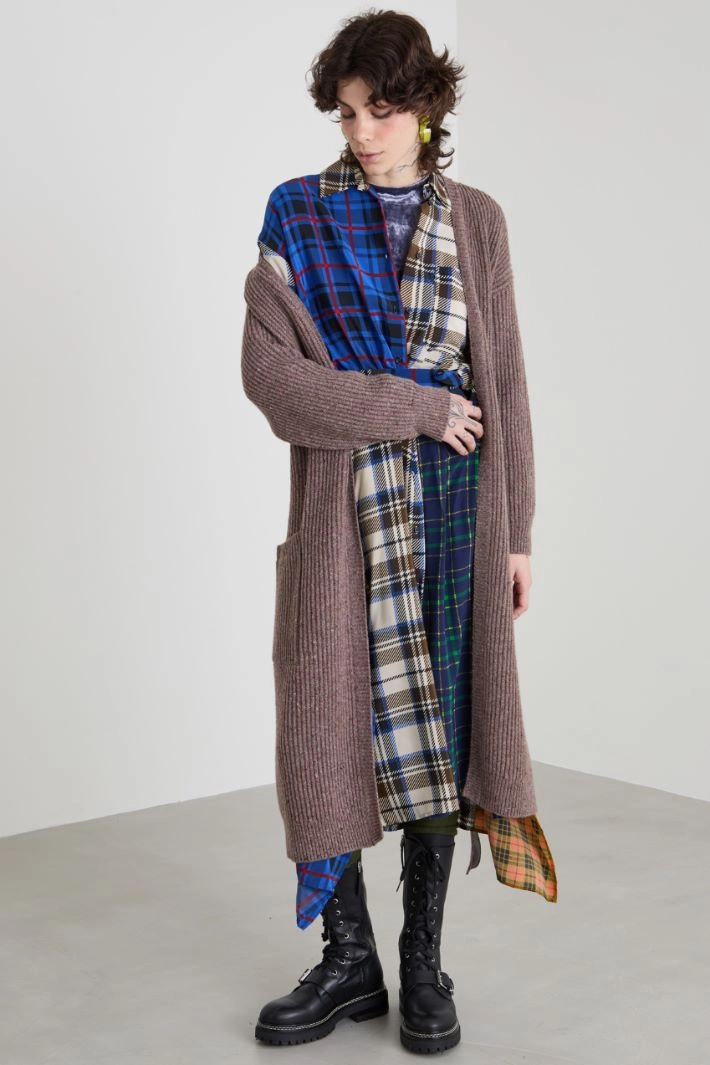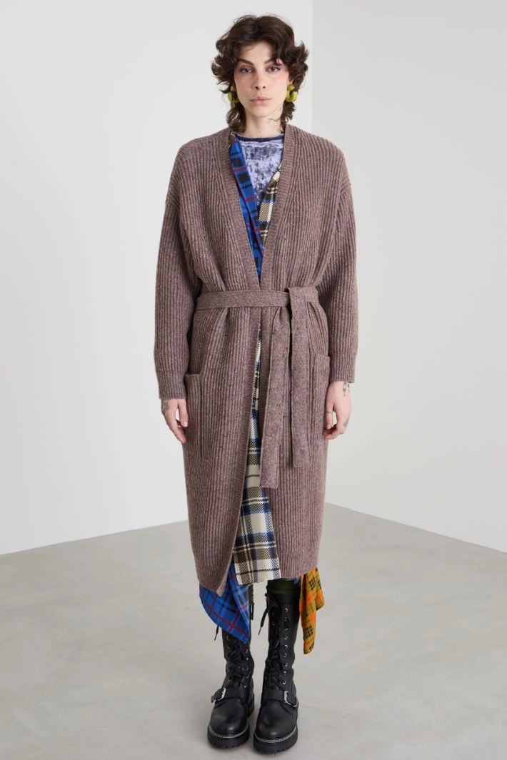 Long loose-fitting open-front cardigan in stretch wool blend yarn, with ribbed knit, V-neck, long dropped sleeves and side patch pockets. Fastened with a matching belt.