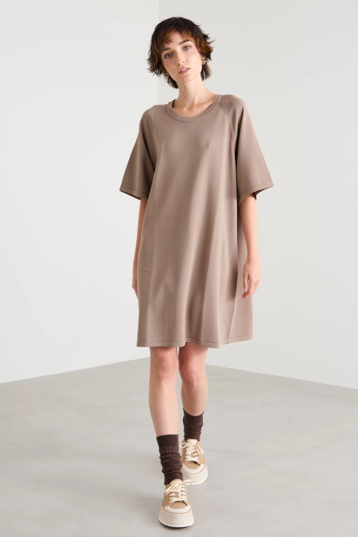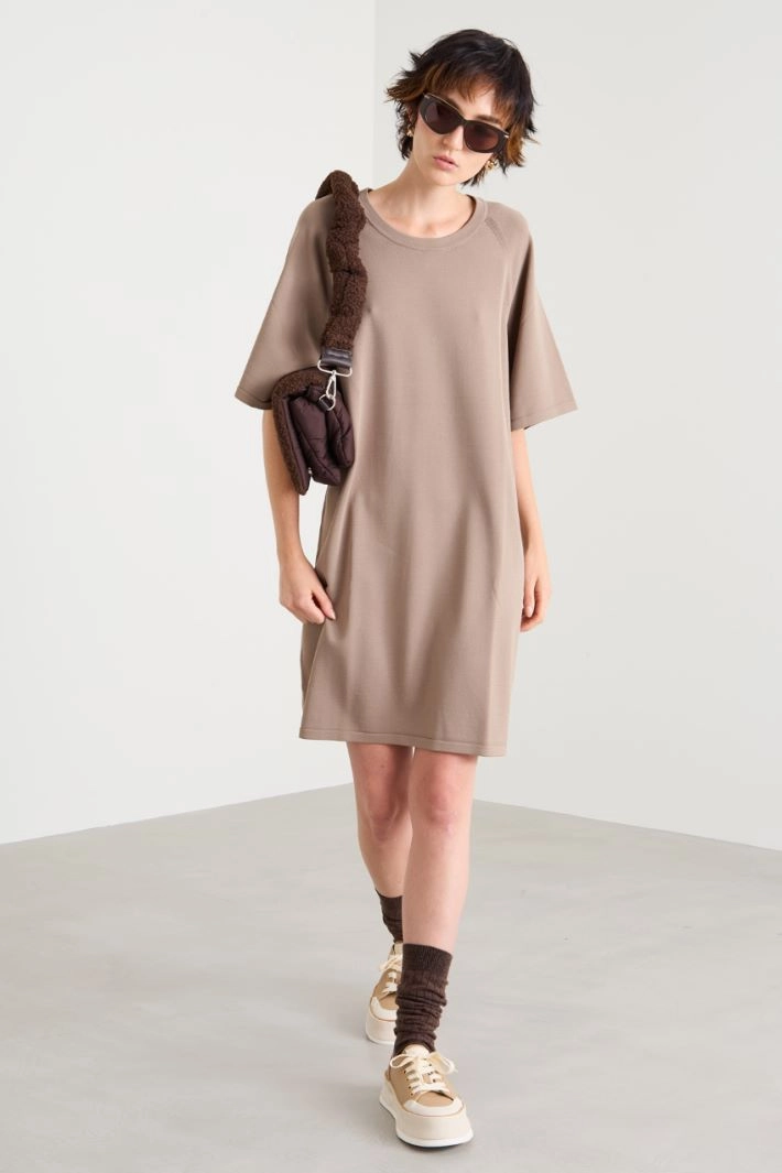 Straight-cut dress in viscose blend crepe knit, with round neckline and short raglan sleeves.