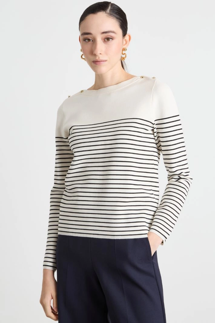 Straight-fit jumper crafted from stretch viscose yarn with a jacquard pattern, featuring a boat neckline, knot button detail on the shoulders and long sleeves.