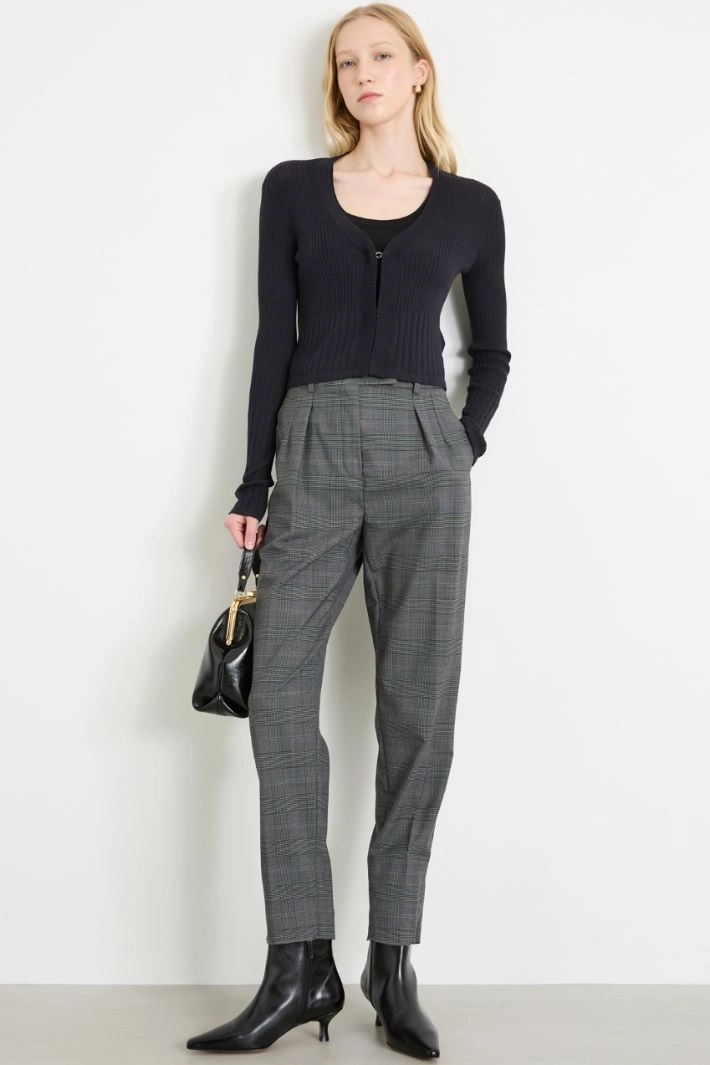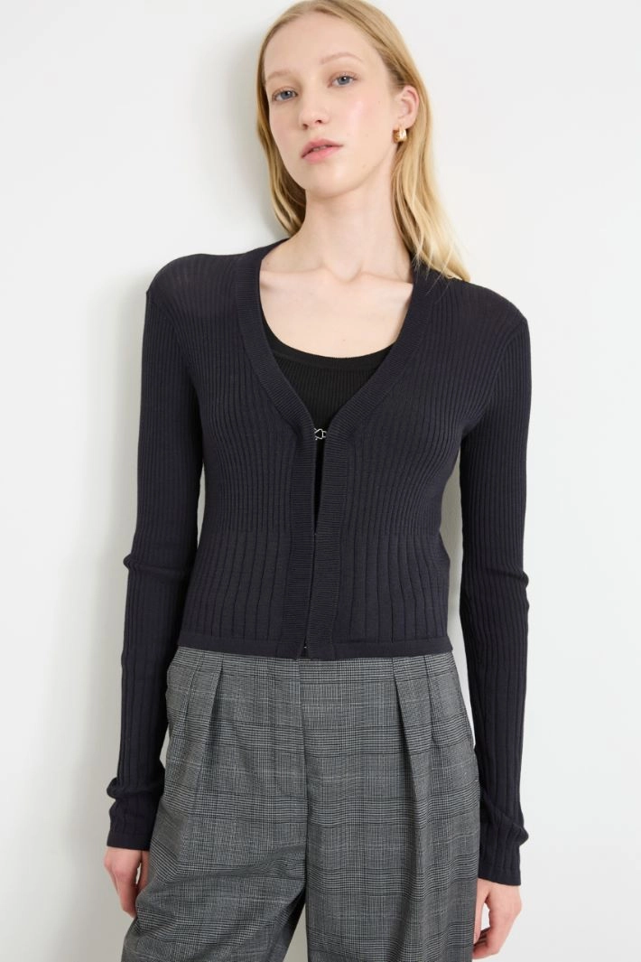 Boxy cropped cardigan in cotton yarn and natural fiber, with asymmetrical ribbing, V-neck, long sleeves and hook fastening.