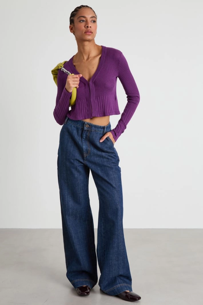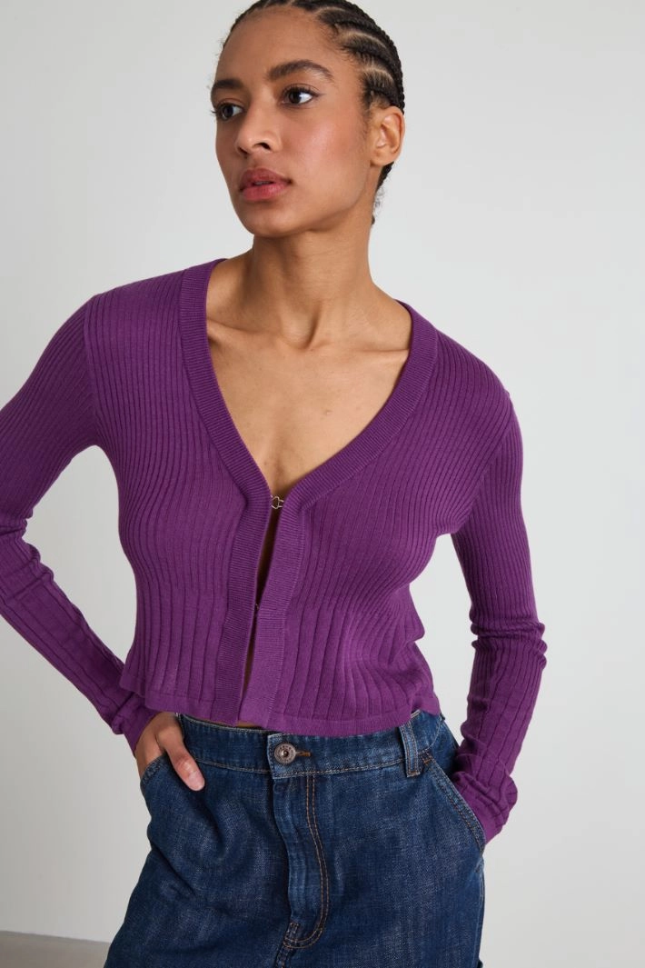 Boxy cropped cardigan in cotton yarn and natural fiber, with asymmetrical ribbing, V-neck, long sleeves and hook fastening.