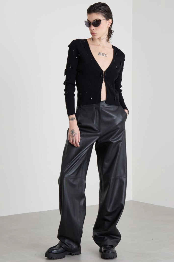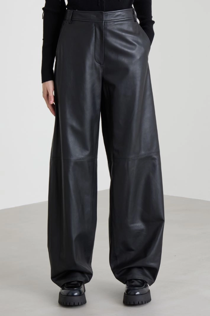 Straight and loose trousers in genuine nappa leather, with belt loops, side French pockets and hidden fastening with zip, button and hook. Lined.