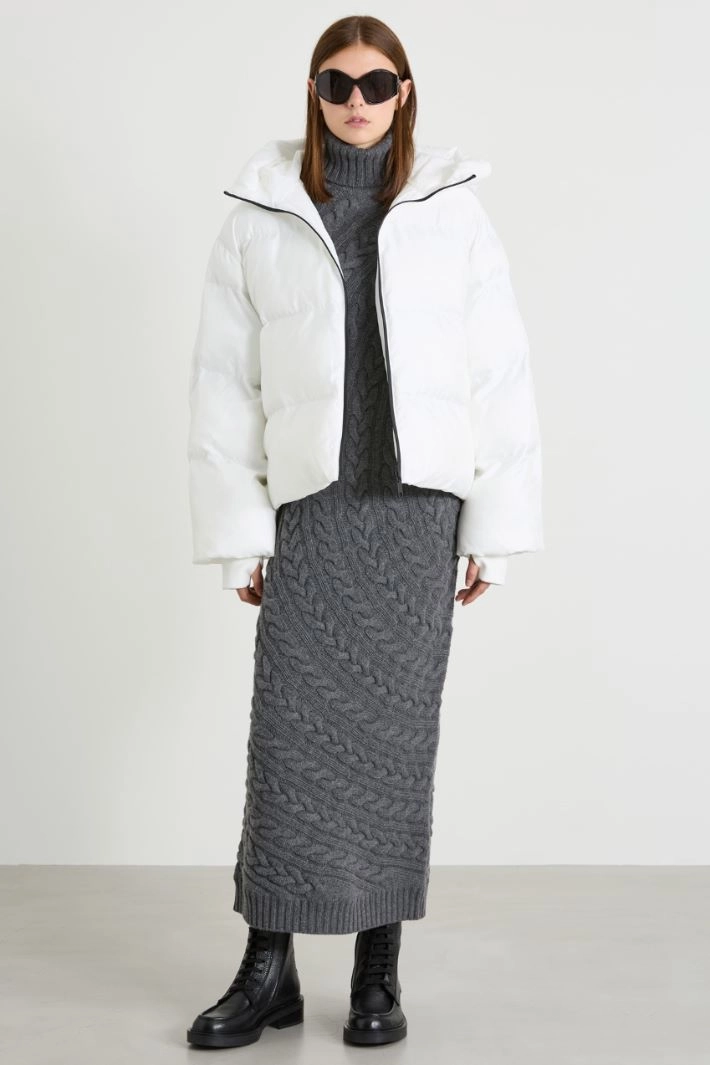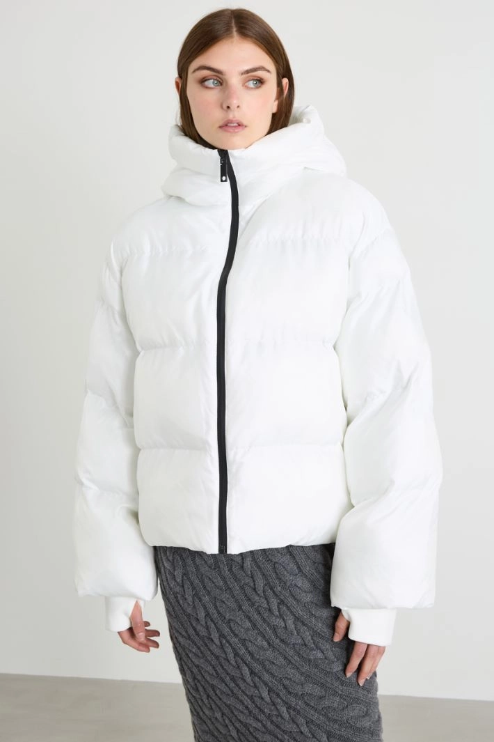 Padded with a straight fit in technical fabric with an shiny finish, with a quilted motif, high collar with hood, long sleeves with knitted cuffs and inset side pockets. Zip fastening.