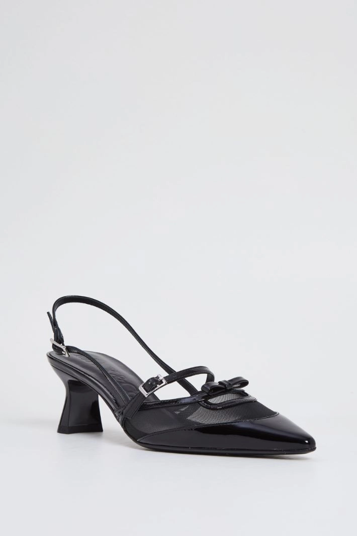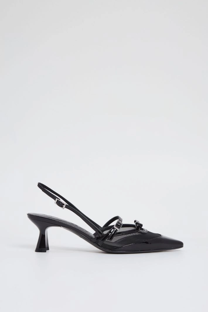 Slingbacks in genuine leather with a patent finish and technical tulle inserts. Adjustable buckle strap fastening, pointed toe and squared spool heel. Leather lining, leather sole.