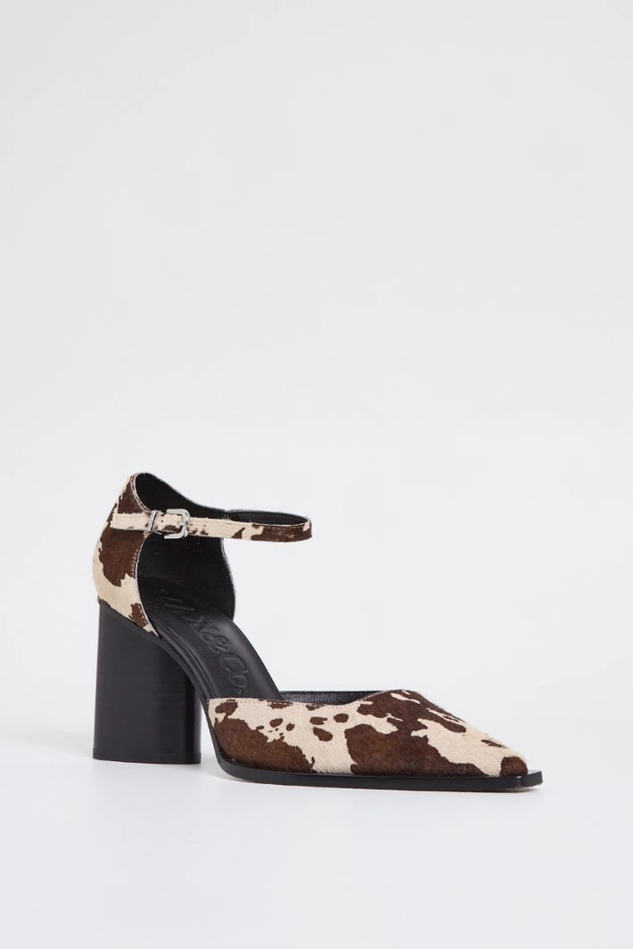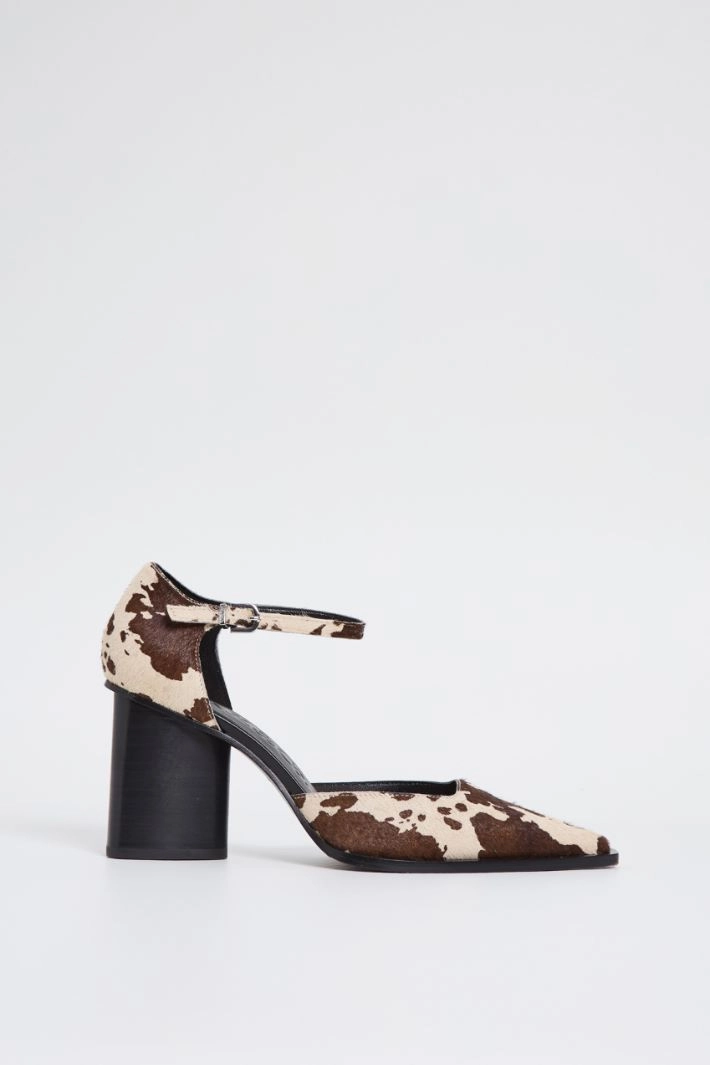 Ponyskin shoes with a square neckline, pointed toe, rounded triangular column heel and adjustable ankle strap closure. Leather lining, leather sole.