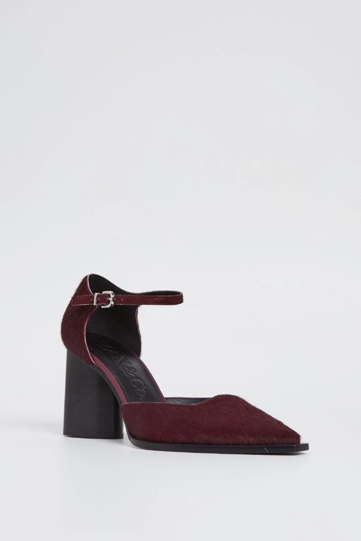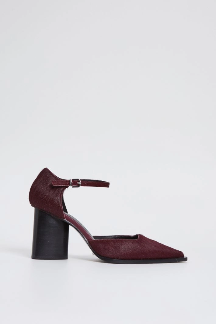 Ponyskin shoes with a square neckline, pointed toe, rounded triangular column heel and adjustable ankle strap closure. Leather lining, leather sole.