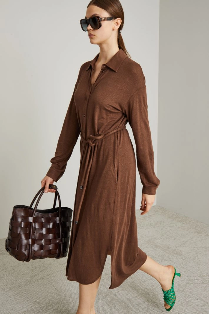 Loose-fitting shirt dress in stretch linen jersey, with polo collar, long dropped sleeves with buttoned cuffs, inset side pockets, side slits and longer hem at the back. Button fastening. Tubular belt with matching metal ends.