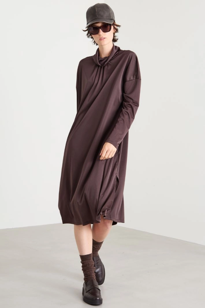 A-line dress in flowing satin jersey, with high neck, long dropped sleeves, inset side pockets and slits at the bottom.