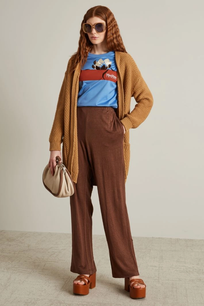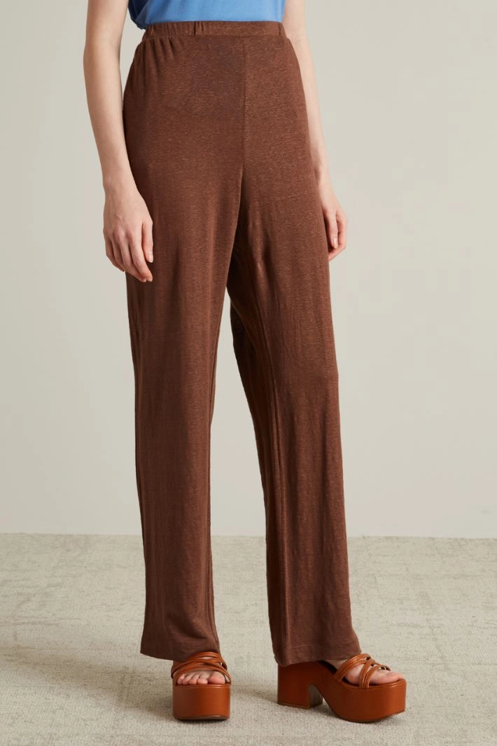 Loose-fit linen jersey trousers with elastic waistband and French pockets.