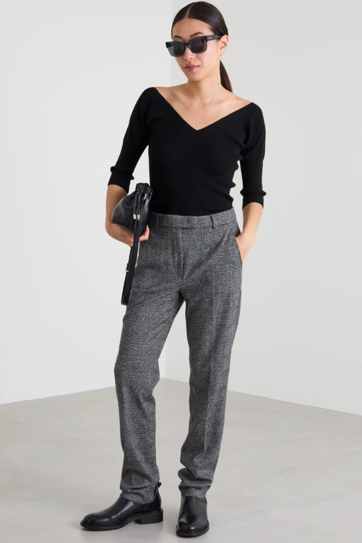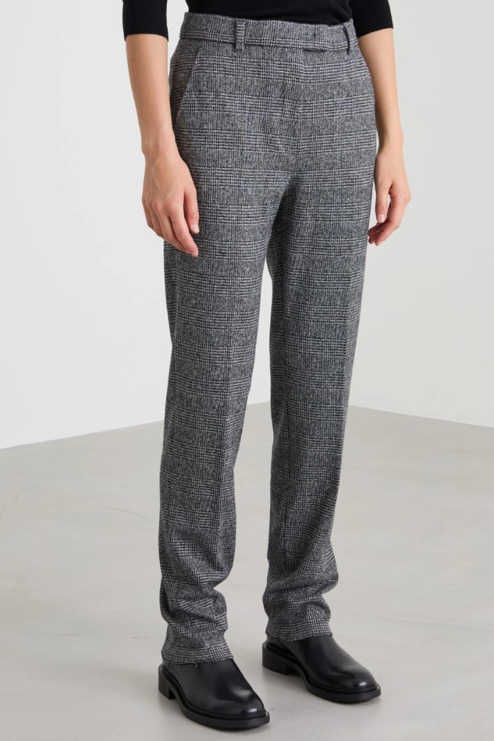 Straight-cut trousers in cotton and viscose blend jersey, belt loops at the waist, French pockets on the sides and crease along the length. Fastening with zip, button and hidden hook.