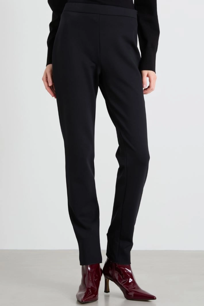 Slim-fit trousers in compact stretch jersey, with invisible zip fastening and hook on the side.