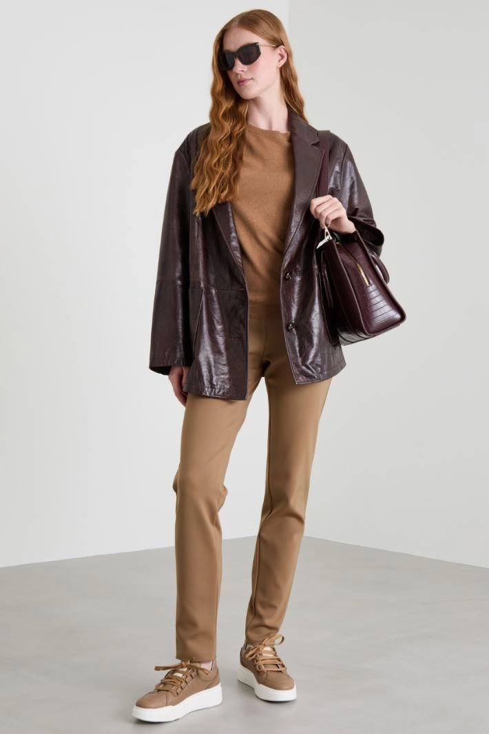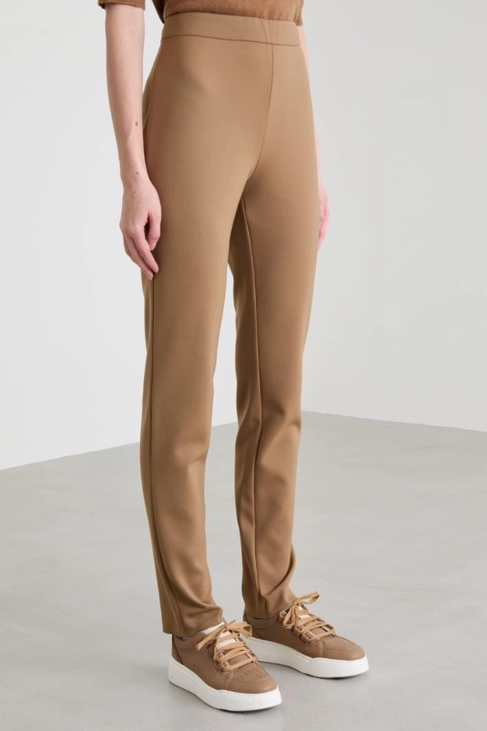 Slim-fit trousers in compact stretch jersey, with invisible zip fastening and hook on the side.