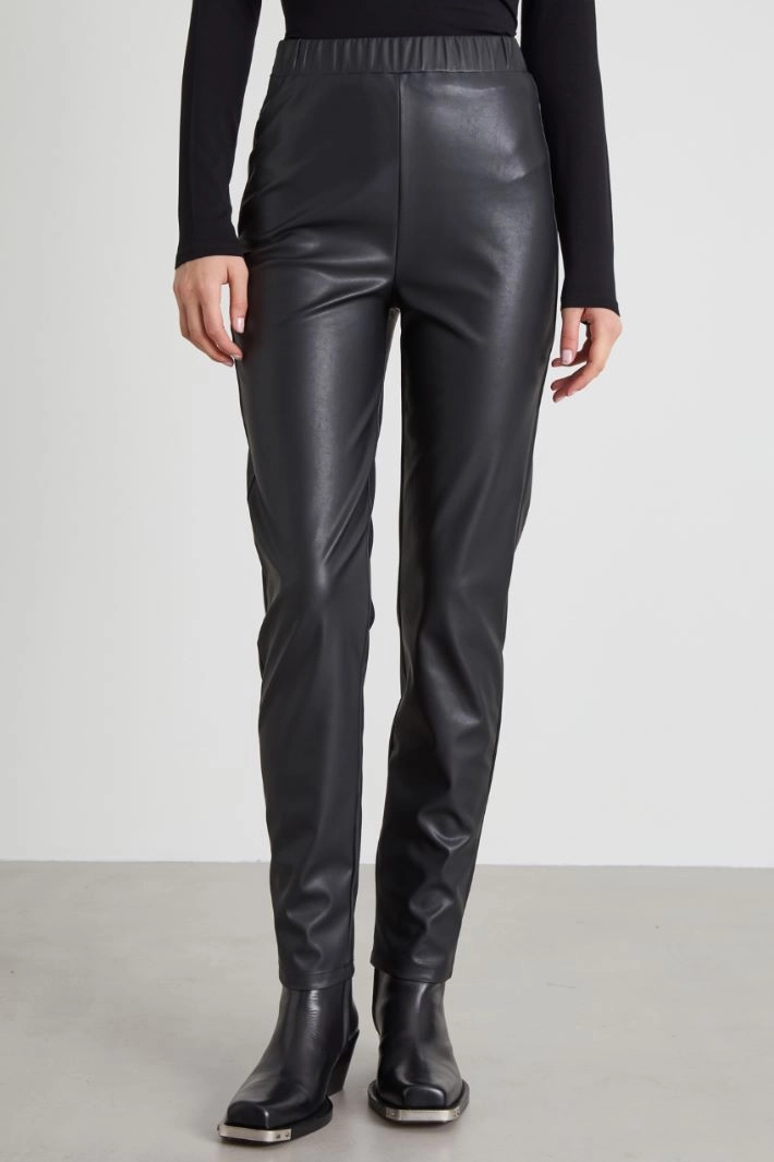 Tight-fitting faux leather leggings with elastic insert at the waist.