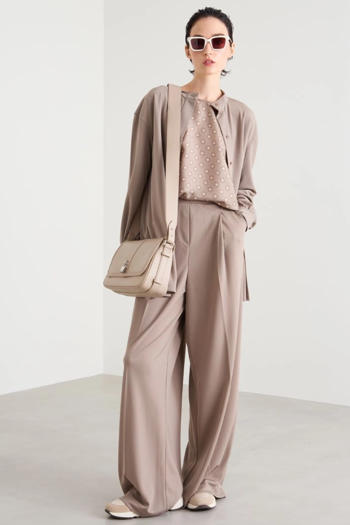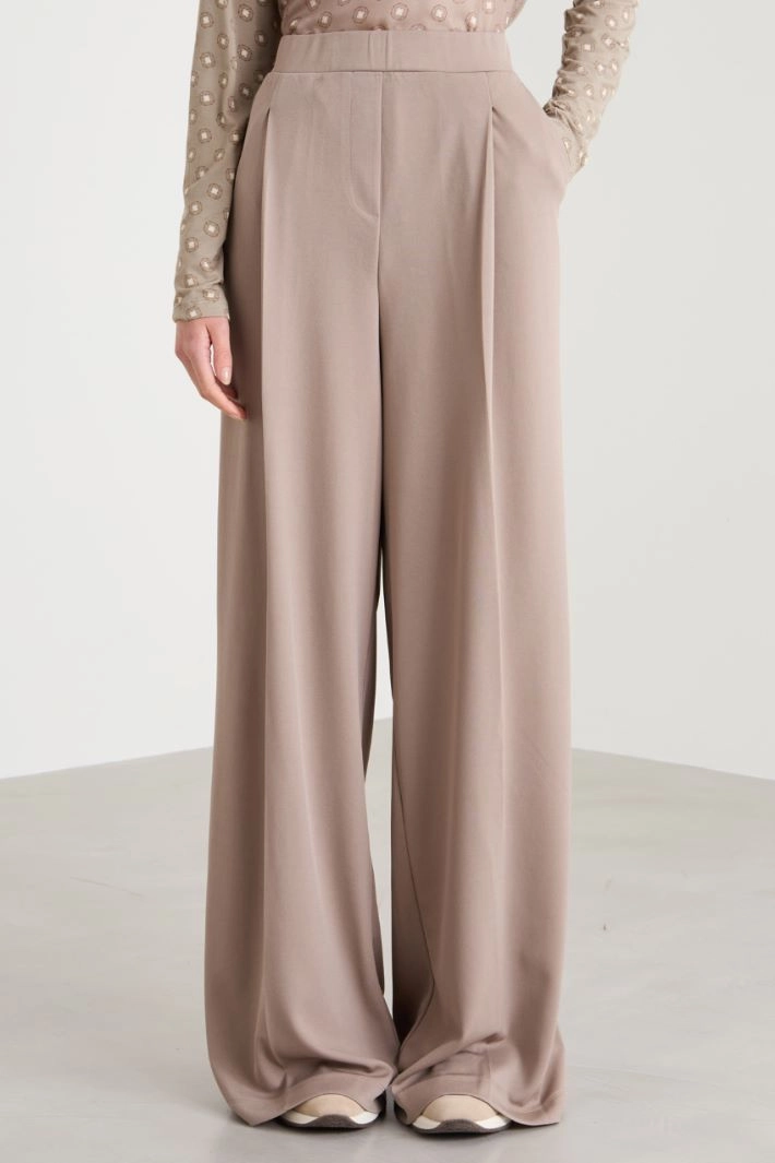 Loose-fit trousers in technical jersey, with elastic insert, darts at the waist and French side pockets.