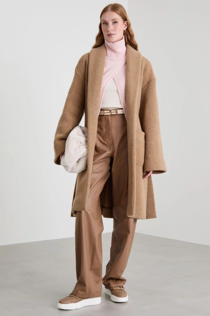 Straight-cut coat in wool-blend bouclé jersey, with shawl collar, dropped-shoulder sleeves and side patch pockets. Side slits and matching belt fastening. Unlined.