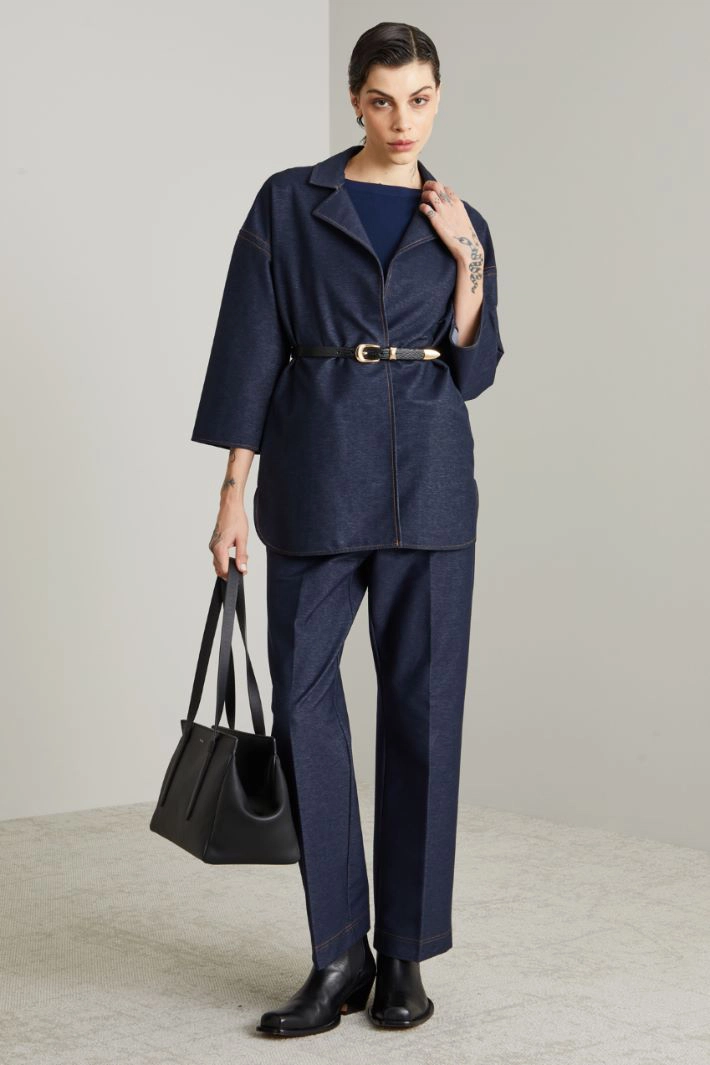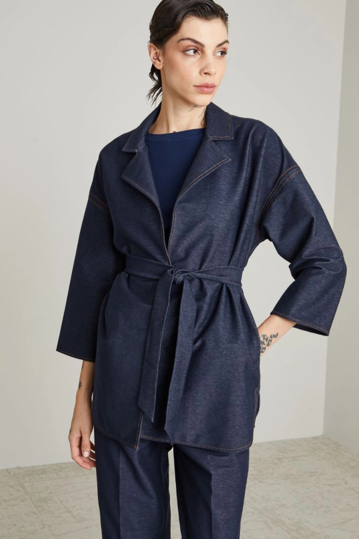 Loose-fit jacket in stretch cotton blend jersey with a denim effect, with contrasting stitching, lapel collar, long dropped sleeves, side pockets inset in the seam and fastening with a matching belt. Unlined.