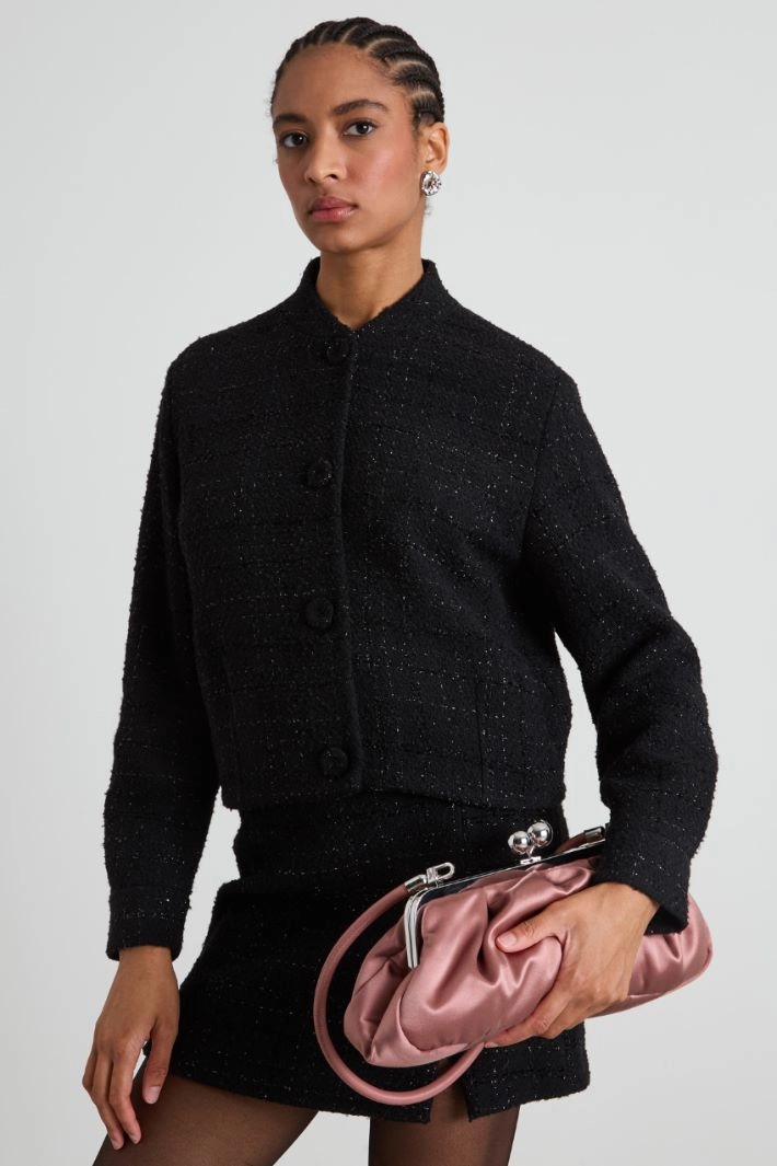 Straight-fit bomber jacket in lamé wool blend tweed, with stand-up collar, long sleeves, inset side pockets and single-breasted fastening with covered buttons. Lined.