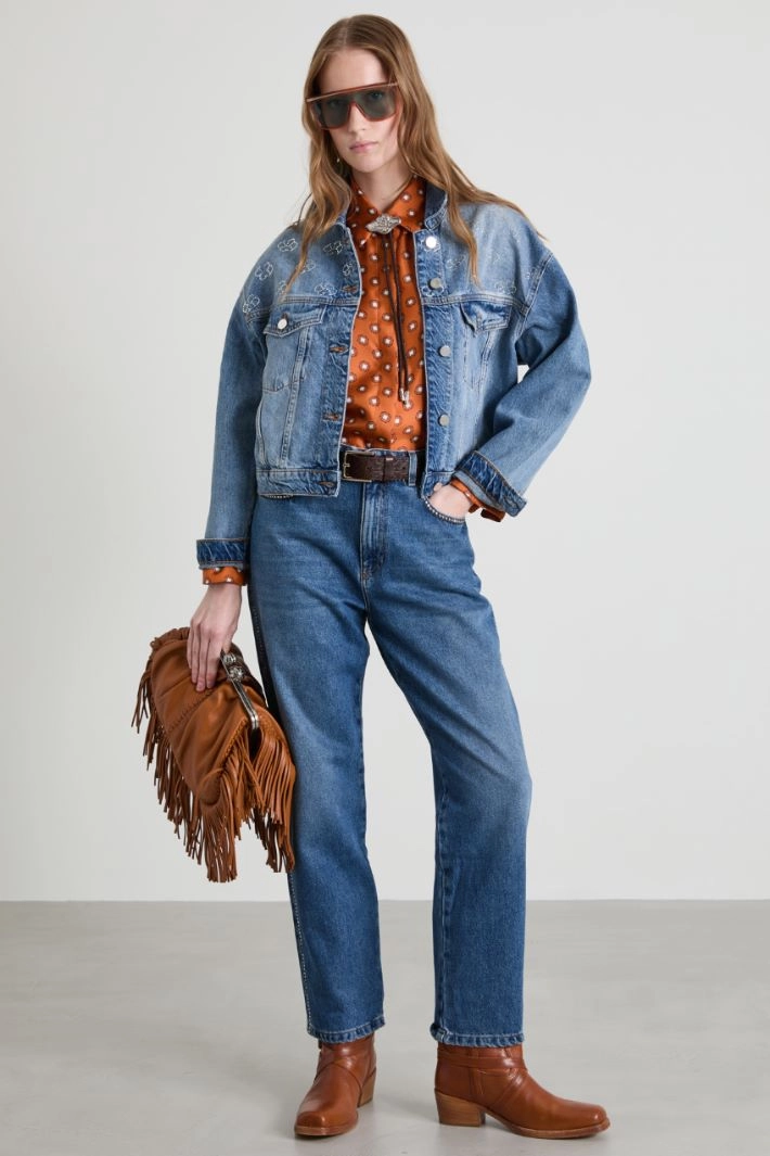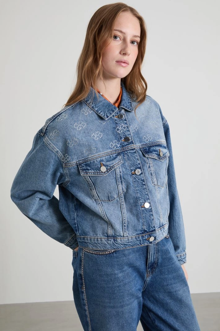 Slightly fitted jacket in pure cotton denim with rhinestone motif, shirt collar, long sleeves with dropped shoulders and buttoned cuffs, and flap pockets with button at the front. Button fastening at the front.