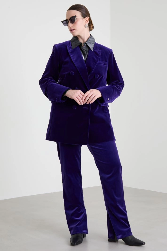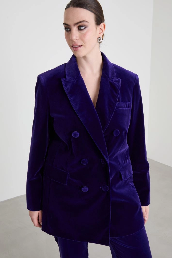 Slightly fitted blazer in stretch cotton velvet with matching polka dot trim, lapel collar, long sleeves with covered buttons and side welt pockets with flaps. Central vent on the back and double-breasted fastening with buttons. Lined.