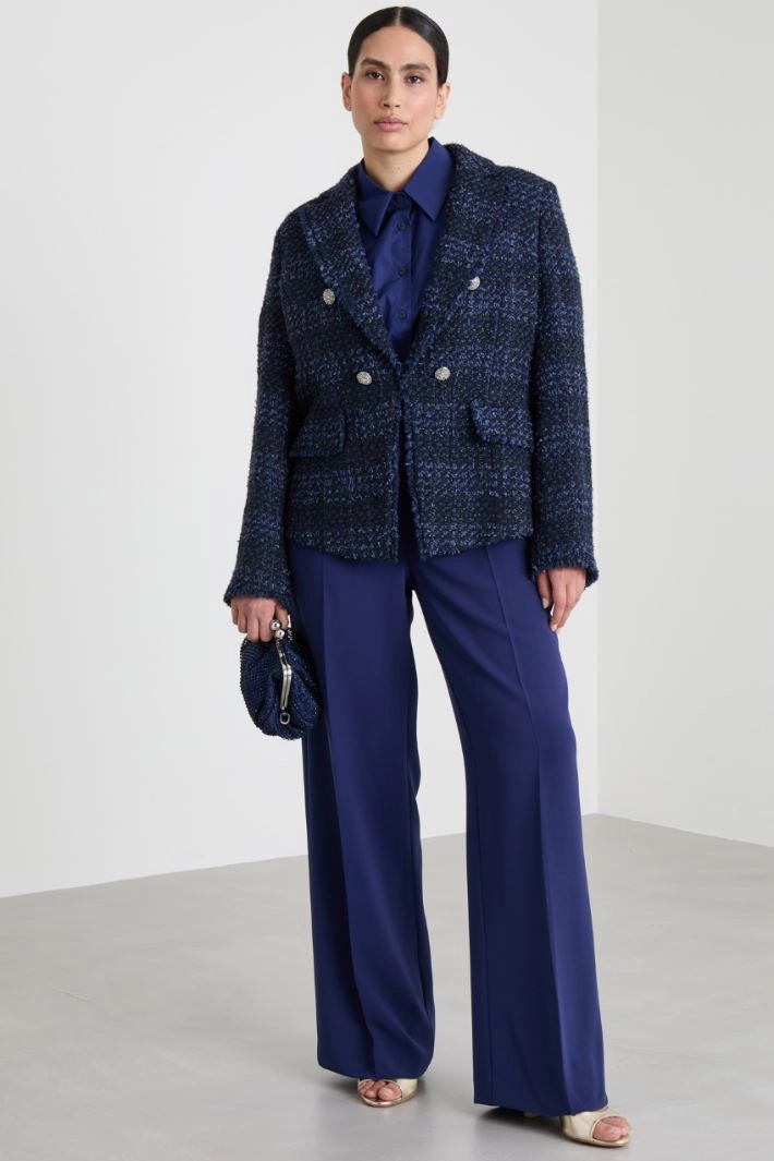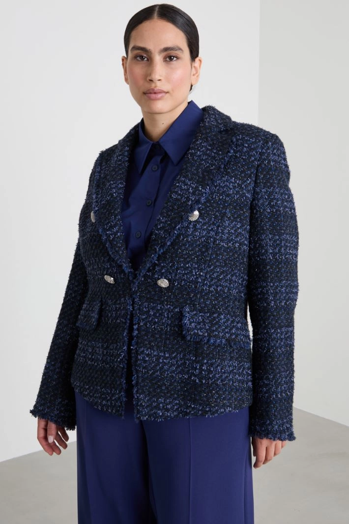 Fitted blazer in lamé cotton blend tweed, featuring a lapel collar, long buttoned sleeves and faux flap side pockets. Decorative jewel button motif and single-breasted hook fastening. Lined.