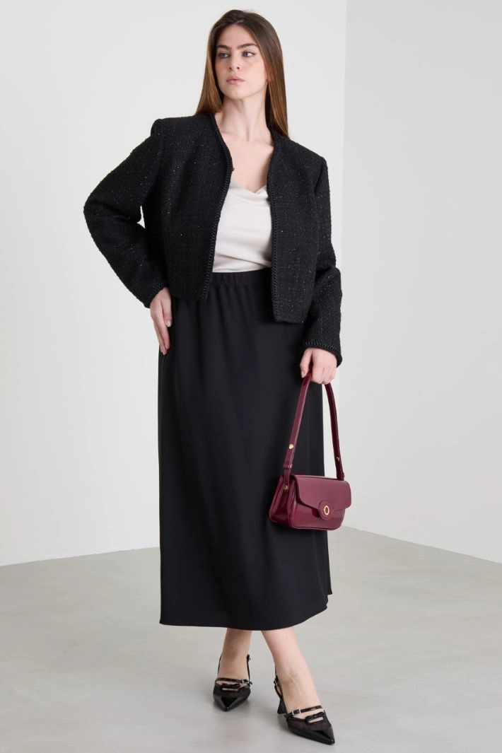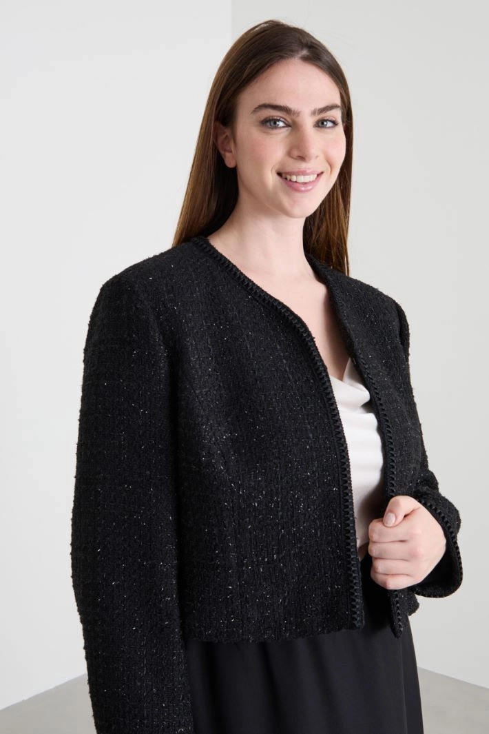 Straight-fit jacket in lamé cotton blend, with V-neck, long sleeves and trims finished with matching trimmings. Single-breasted fastening with hooks. Lined.